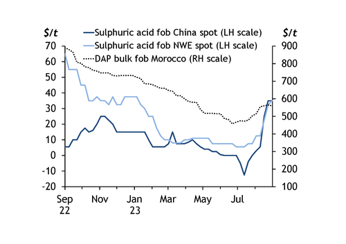 Chinese acid fobs rose by $29/t on average since mid-August, when OCP entered the market, while northwest European acid fobs rose by $23/t on average.