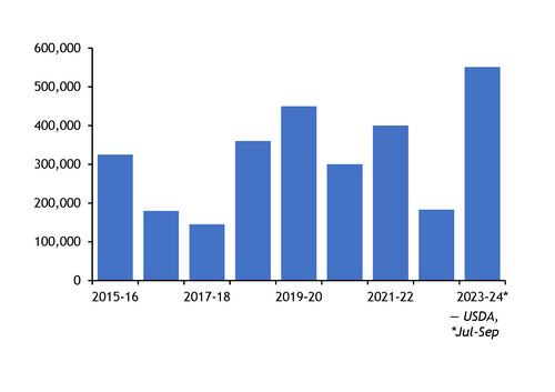 Based on RSO exports and an RSO-to-RSM production ratio of 40:56, Ukraine is already likely to have crushed up to 550,000t of the 2023 rapeseed crop (see chart). This is already higher than 2019-20's confirmed record of 450,000t and well above last season's 183,000t, according to the US Department of Agriculture (USDA). It is also above USDA's 525,000t projection for this season.