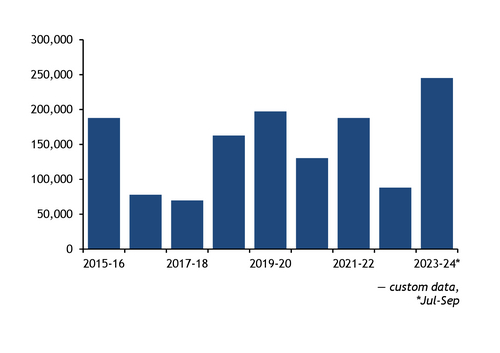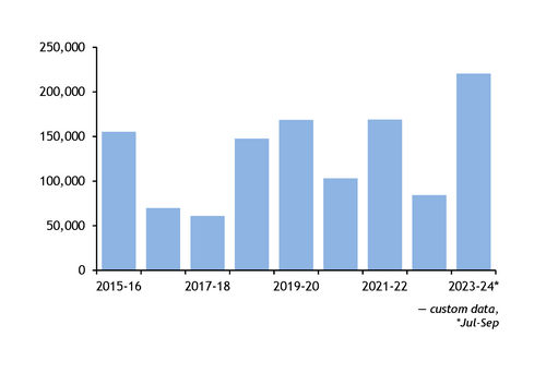 Ukraine exported 223,000t of rapeseed oil (RSO) and 252,000t of rapeseed meal (RSM) in July-September, up from 84,200t and 88,100t, respectively, in the whole 2022-23 (see charts).