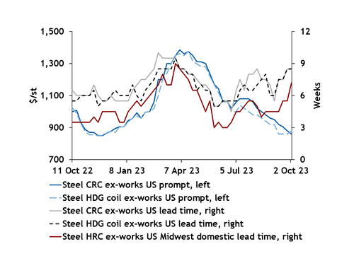 US steel mills are reportedly digesting large tonnage transactions made in the last week that pushed out hot rolled coil (HRC) lead times to 7.2 weeks this week from 5.5 weeks in the prior week. The HRC and HDG lead time spread is the narrowest since 1 August.