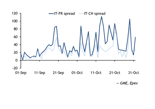 The Italian single national wholesale power price (Pun) increased its premium to France and Switzerland in October, although November expiry prices suggest spreads could tighten again this month.