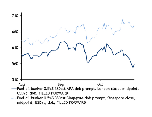 At ARA, low demand and sufficient supply have weighed on prices. A combination of winter in northwest Europe and weak regional economic indicators have eased shipping demand. And buyers have taken to the side-lines in anticipation of prices falling, according to participants. Northwest European bunker prices tracked losses in the front-month Ice Brent crude futures contract in October, when the latter fell below $90/bl.