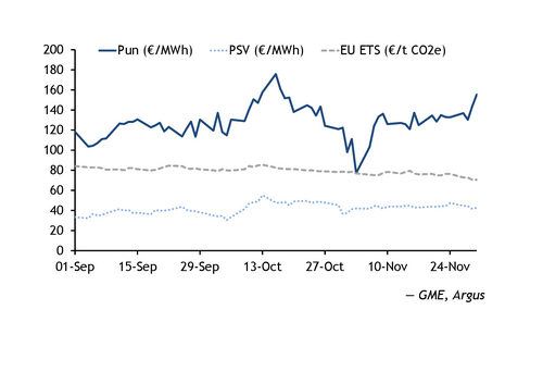 Italian wholesale prices were little affected by movements in the PSV gas market, while falling EU carbon allowance prices had more of an impact. The PSV day-ahead contract was assessed by Argus at an average of €43.32/MWh in November, down by just 1.7pc on the month, against a 0.1pc fall on the equivalent Dutch TTF product. But prompt EU emissions trading system (ETS) allowances fell by 6.3pc to €75.82/t CO2e, weighing on emissions costs for Italian gas and coal-fired plants (see chart).