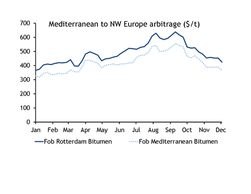 Arbitrage shipments from the Mediterranean to the US east coast and east of Suez have been hard to work for most of the year, limiting export options for the region's surplus bitumen supply. The spread between Argus' fob Mediterranean bitumen index and fob Rotterdam cargoes has been volatile this year. It was at its lowest in early January at around $38/t and peaked in mid-June at over $103/t. As of 8 December, it stood at just under $59/t in favour of Rotterdam.