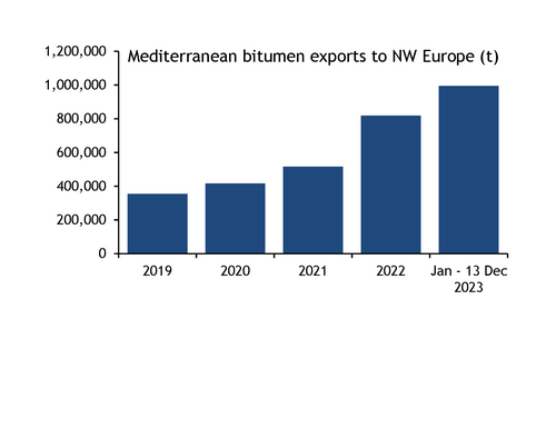 Bitumen exports from the Mediterranean region to northwest Europe are on track to surpass 1mn t this year, double the levels of just two years ago.