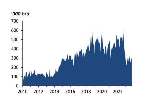 An increase in Venezuelan Merey crude imports to the US could help offset any declines from Mexico and Canada. Venezuelan crude returned to Gulf coast refineries in January 2023 following a three-year hiatus, after the US partially eased sanctions on the country in November 2022. US imports from Venezuela more than quadrupled to 166,000 b/d in October from 40,000 b/d in January, according to the latest EIA data.