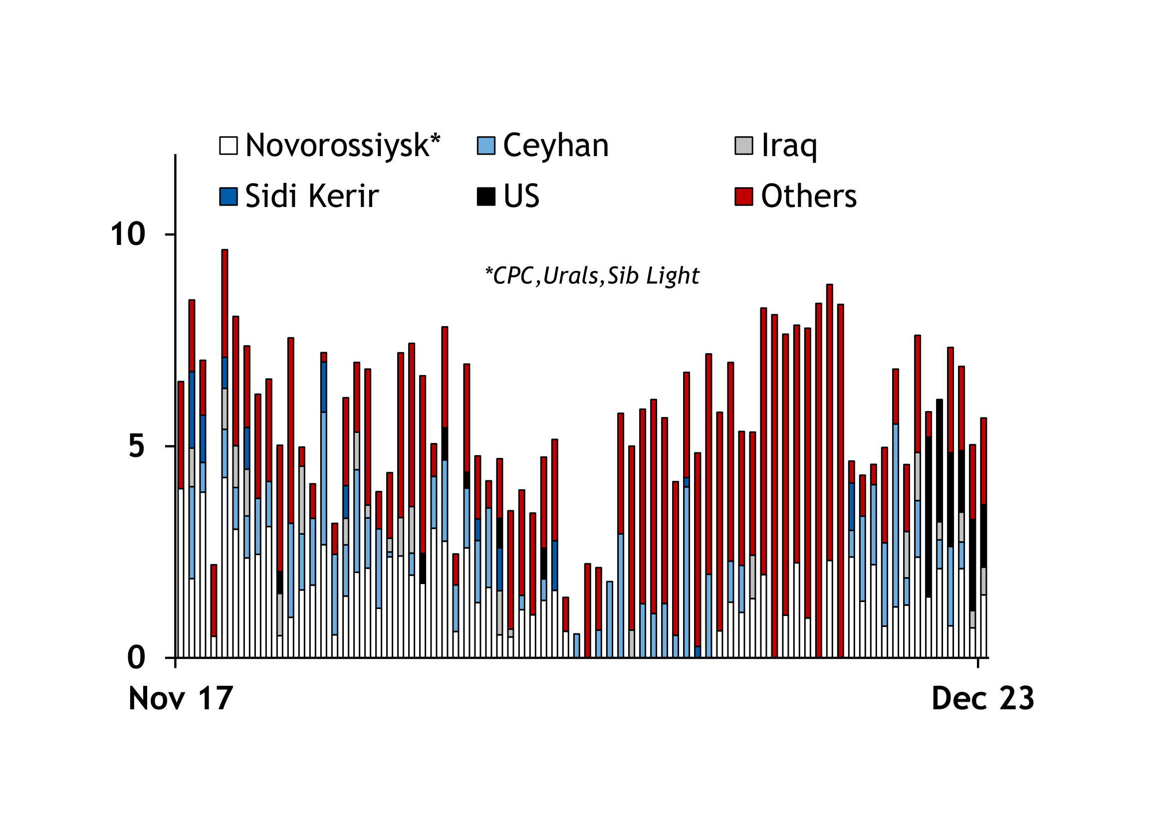 Argus assessed these deliveries at a weighted average gravity of 37.6°API and 0.8pc sulphur content, compared with 38.2°API and 0.6pc sulphur in November. Receipts in 2023 were estimated at 38.4°API and 0.7pc sulphur, much lighter than Lukoil's Urals-based 2022 slate of 35°API and 0.9pc sulphur.