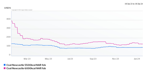 NSWEC realised an average coal price of $123.29/t in July-December 2023, down from $157.21/t in January-June 2023, and from $354.30/t in July-December 2022. The Argus high-grade 6,000 kcal/kg NAR price averaged $139.15/t fob Newcastle, with the 5,500kcal/kg NAR coal price at $92.11/t during July-December, compared with $212.07/t and $115.65/t respectively for January-June.