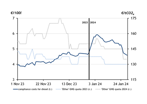 Weak demand for GHG certificates and low biofuel prices in January contributed to compliance costs in 2024 being almost at parity with those in 2023, despite a significant increase in the GHG quota at the turn of the year from 8pc to expected 9.35pc.