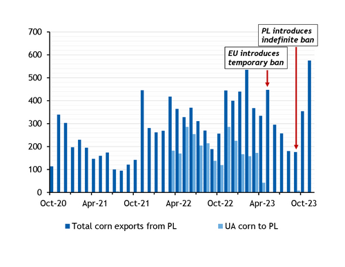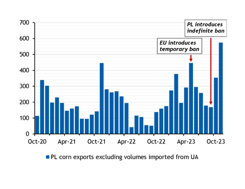 Before the EU ban, Ukrainian exporters could make only limited use of the country's Black Sea ports. This is no longer the case, and Ukraine has been actively shipping corn out of its POC ports, with 3.36mn t exported in January alone.