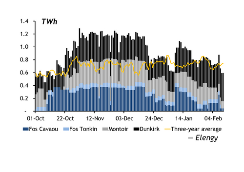 French LNG sendout already fell to its lowest since 15 October on 10 February. French regasification slipped to 611 GWh on 10 February, from 781 GWh/d earlier in the month (see sendout graph).