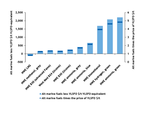 Northwest Europe LNG was selling at 0.8 times the price of VLSFO on average from 1-21 March, Argus assessments showed (see chart). Methanol and B30 bio-bunker comprised of advanced fatty acid methyl ester (Fame) were priced at 1.3 times the price of VLSFO in northwest Europe during the same period. Blue ammonia, green ammonia, green hydrogen and bio-methanol were pegged at 2.1-4.8 times the price of VLSFO.