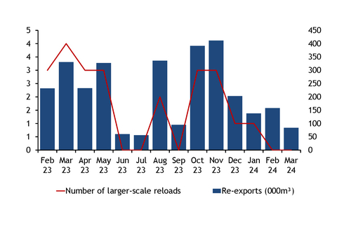 Spanish re-exports have been muted since the start of the year, as a narrowing price differential between Spain's PVB and northern European hubs may be too small to cover the cost of reloads in Spain. Day-ahead prices on Spain's Mibgas exchange were on average at parity with the TTF in March, in from discounts of €0.42/MWh in February and €0.65/MWh in January.