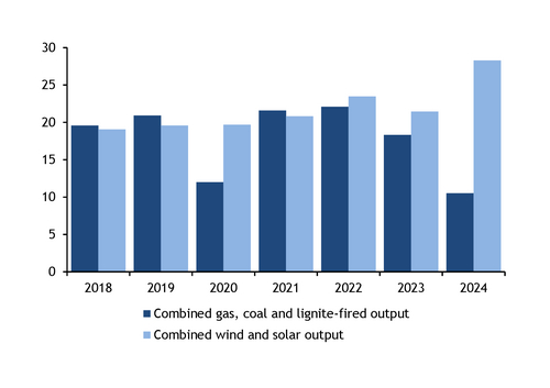 Combined onshore and offshore wind generation has climbed to 19.65GW this month, well above the 13.4GW average for April 2019-23. And solar output has averaged above 8.6GW, a new high for April.