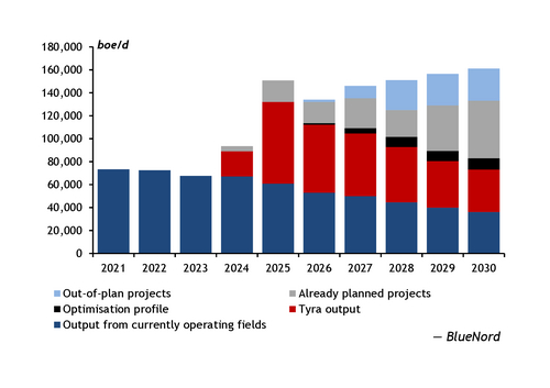 But BlueNord also lists so-called "out-of plan projects", which may boost production later this decade. Last week's investor update shows substantially more out-of-plan projects than the annual report published in April, with the potential to lift total production above 2025 levels later this decade. That said, BlueNord still gave its expected minimum total plateau production in 2030 as 40,000 boe/d, down from the peak in 2025 at 55,000 boe/d.