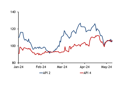 The South African API 4 index stood at a 98¢/t and $1.12/t premium to the European API 2 on 9 and 10 May, respectively, Argus assessments show. South African spot prices were last at a premium to API 2 on 13 February, and following this API 2 prices rose sharply, from $92.68/t to $126.58/t by the end of March following a flurry of spot activity.