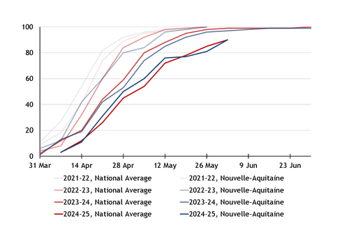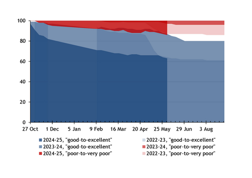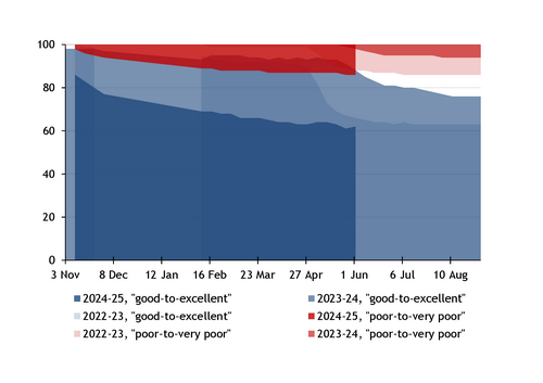 Nearly all of France's 2024-25 wheat crop reached the heading stage in early June but the crop conditions remain considerably worse than a year ago. Wheat areas rated "good-to-excellent" were lower than at any point in the 2022-23 and 2023-24 seasons at 62pc. Soft wheat areas nationally rated "poor-to-very poor" did not show any improvement from 14pc in late May.