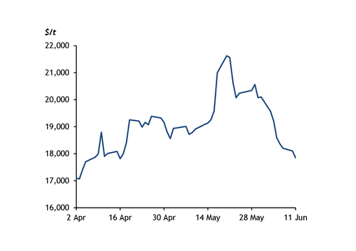 But the tide has turned as benchmark nickel has since shed 17.7pc to settle at $17,855/t today, reflecting more physical fundamentals. While the contract continues to be net long on the LME, combined long and short positions declined by 4,761 lots between 17 May and 31 May, LME data show, to suggest a possible easing of fund money movement into the market. Prices are now finding lower ground on declining Chinese stainless steel prices, which themselves are under pressure from Beijing's planned curbs on steel production for this year.