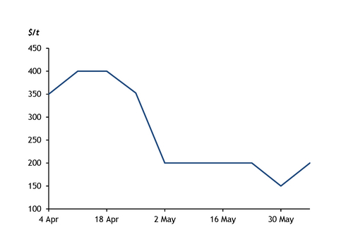 The Argus assessment for the nickel cathode full-plate premium (non-Russian origin) in-warehouse Rotterdam more than halved from an average of $350/t on 28 March to average of $150/t on 30 May on the back of new Indonesia production flowing into Europe, while the corresponding premium for 4x4 inch cathode (non-Russian origin) fell by nearly 30pc over the same period to $400/t on 30 May.
