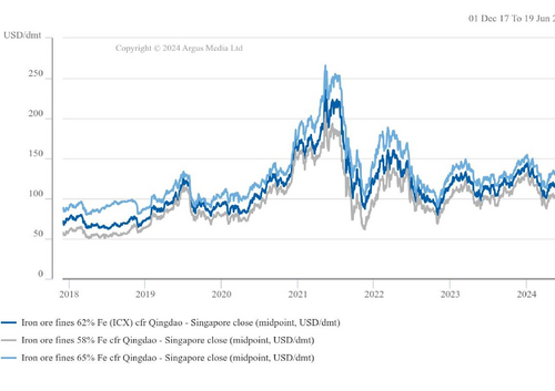 The Argus ICX 62pc Fe iron ore price averaged $117.45/dry metric tonne (dmt) cfr Qingdao January-June this year compared with $121.47/dmt for July-December 2023. It was last assessed at $107.10/dmt on 19 June.