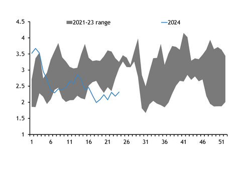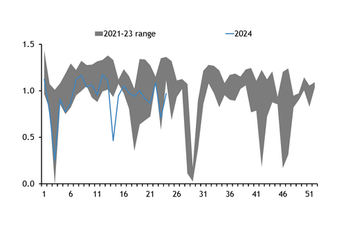 Weekly rail deliveries to RBCT have averaged 927,000t in 2024, equivalent to 48.2mn t on an annualised basis. This is a slight improvement compared with 47.7mn t in 2023, but still significantly down from pre-Covid-19 levels of 60mn-70mn t/yr.
