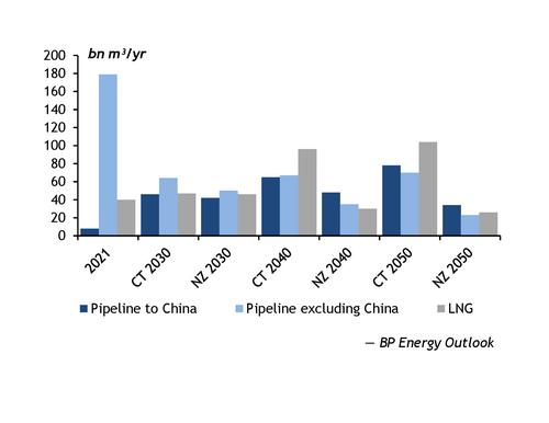 On the contrary, the Net Zero scenario has Russian exports falling to 83bn m³/yr by 2050, with pipeline exports to China accounting for the greatest share at 34bn m³/yr that year.