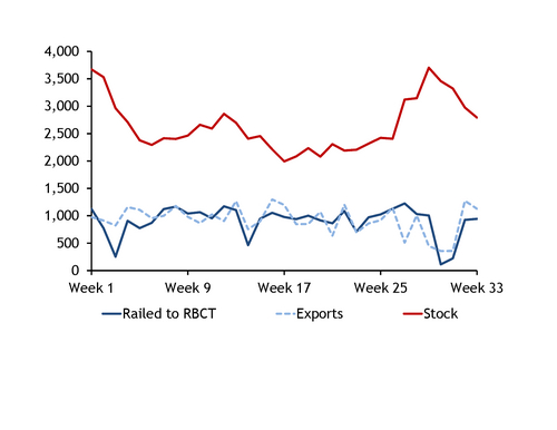 Despite the decline, exported volumes from RBCT remain well above the average weekly exports of 921,400t this year.