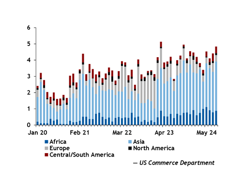 A total of 4.83mn short tons (4.39mn metric tonnes) of US steam coal left US ports during the month, preliminary figures from the US Commerce Department show. That was the most since October 2023 and up from 3.99mn st in August 2023.