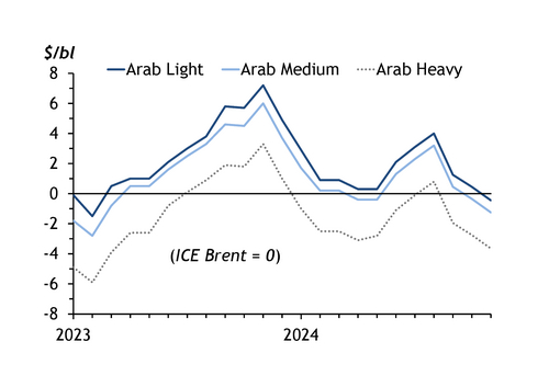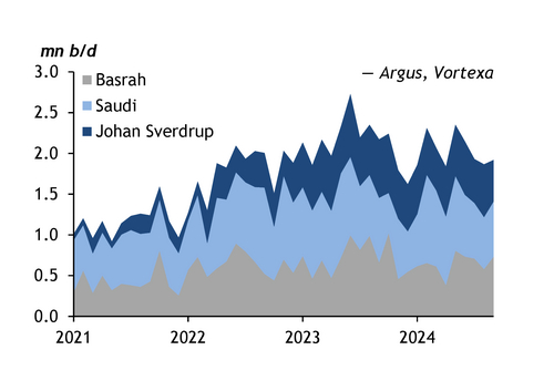 The reductions have left Saudi Arab Medium looking more competitive relative to spot Norwegian medium sour Johan Sverdrup. Aramco set the November formula price of Arab Medium to northwest Europe at a $1.25/bl discount to Ice Brent, its widest since February 2023. Johan Sverdrup is currently assessed at a 70¢/bl discount to benchmark North Sea Dated, which averaged a 91¢/bl premium to Ice Brent in January-September this year, underscoring the competitiveness of Saudi supplies.