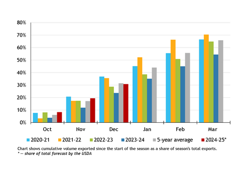 This brought Ukraine's cumulative corn exports for October-December to 30.8pc of the total 23mn t projected for 2024-25. This is below the five-year average of 31.4pc for the same period and well below the 36.8pc reached in the first three months of the 2020-21 marketing year.