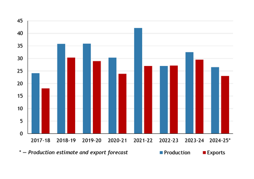 Ukraine's corn production could fall to 26.5mn t in 2024-25 from 32.5mn t in the 2023-24 marketing season, according to the US Department of Agriculture's (USDA's) latest forecast, while Argus estimates the country's 2024-25 corn output at 23.9mn t. Dry, hot weather in the summer as the crop developed was the chief driver of the year-on-year output drop, with pre-harvest estimates from some local analysts pegging production volumes even lower — at about 21mn-22mn t.