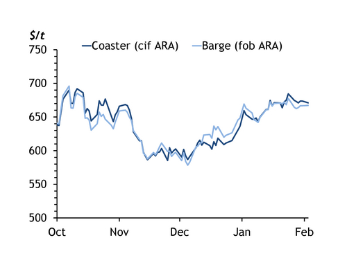 Strong barge prices push blenders to the larger coaster market, which is typically more dependent on petrochemical buying. But coaster supply from gas processing in the North Sea is being undermined by Europe's high natural gas prices that encourage producers to leave as much LPG in the gas stream as possible. Supply-side constraints, and additional buying from blenders looking to seaborne supply, have seen cif ARA coaster assessments rise from 97.5pc to 104pc since late-December, compared with a five-year January average of 96pc.