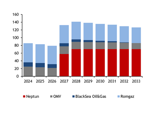 Start-up of the Neptun Deep field in the Black Sea in autumn 2027 or earlier will roughly double Romanian gas production, which already meets around 70pc of annual demand.