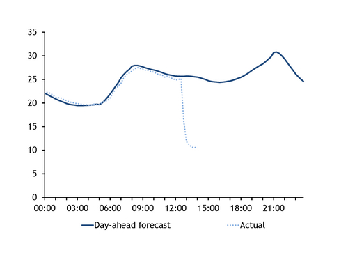 Electricity demand in Spain fell to around 10.5GW at 13:25 local time from around 25GW at 12:30 to 14.2GW at 12:35, data from Spanish system operator Red Electrica show. The operator said that by around 13:30, it had recovered voltage in parts of mainland Spain, and by around 15:30, substations in northern, southern and western Spain were operational and generation units were being connected to secure supply.