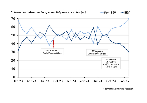 Chinese-owned carmakers have faced fewer constraints, although they have retreated from selling BEVs into Europe (see graph) after tariffs imposed on Chinese-made EVs last year.