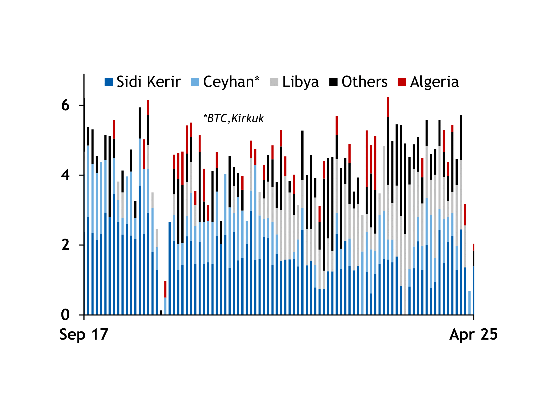 Crude deliveries last month were around 70,000 b/d, up from 20,000 b/d in March. Receipts averaged 95,000 b/d in January-April, down from 160,000 b/d overall in 2024.
