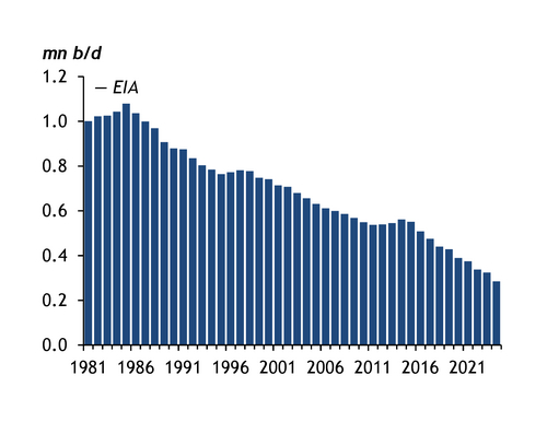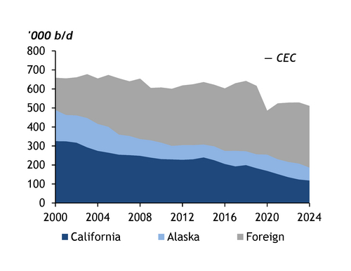 And state regulators are looking at ways to stabilise California crude production to help supply in-state refiners. Crude output in the state dropped to 285,000 b/d in 2024 from above 1mn b/d in the mid-1980s, according to the US Energy Information Administration. California production accounted for about 23pc of crude used by state refineries in 2024, down from 62pc in 1985, according to CEC data. The decline in crude output is largely caused by litigation related to the California Environmental Quality Act (CEQA) that stalled production permitting in Kern County, the CEC said in a 27 June letter to Newsom outlining possible solutions to stop refinery closures during the energy transition.
