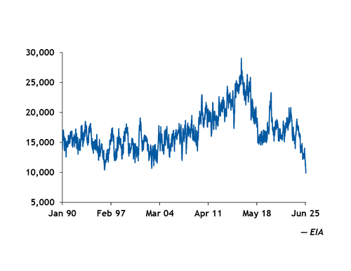 Residual fuel oil inventories in the US Gulf coast have fallen to their lowest level since January 1990 (see chart), with little sign of recovery in the second half of 2025 due to lower domestic output, limited by access to heavy feedstocks and a drop in imports.