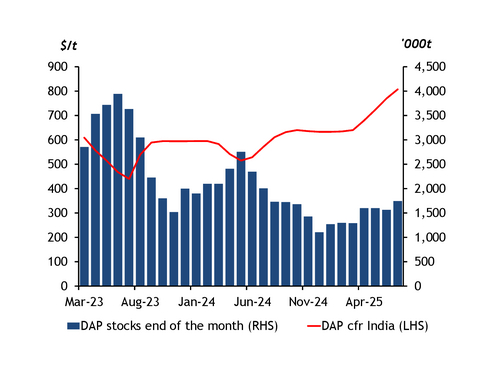 April-July DAP offtake is expected to total 2.58mn t, lagging behind the 2.94mn t sold over the same period last year. But demand could recover as DAP availability improves.