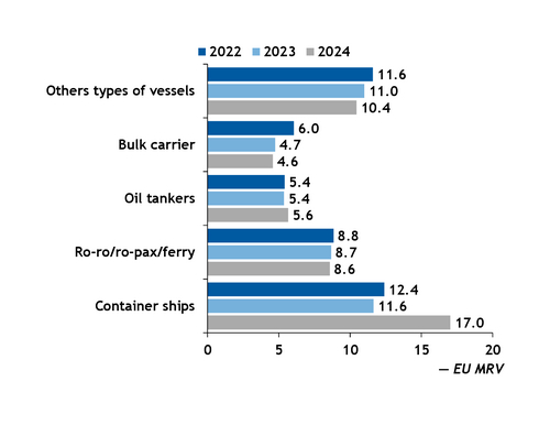 EU bunker demand in 2024 surged by 4.9mn t to 46.3mn t, up 12pc from the previous year, driven largely by longer container ship voyages as vessels avoided the Red Sea following Houthi attacks.