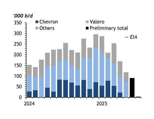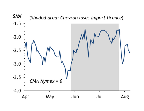 Coking refiners are also likely to reduce consumption of lighter, sweeter crudes as differentials widen. Mars and low-TAN heavy sour Canadian crude at the Texas Gulf are on track to average multi-month lows against their benchmarks for September deliveries. Eight predominantly sour crude producers in Opec+ will raise their collective production target by 547,000 b/d in September, matching an increase in August. And Venezuelan crude is about to return to the Gulf, with Chevron-linked oil tankers already loading in Venezuela after President Donald Trump's administration reversed course on the decision to cancel its licence to operate there. One tanker is already carrying a cargo of Boscan crude from Bajo Grande and another Hamaca crude from the Jose terminal.