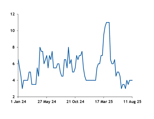 The premium for the Argus 4.5pc sulphur as received assessment to the 6.5pc sulphur assessment on an fob US Gulf basis averaged $3.69/t over the eight week period from mid-June to mid-August, 27pc narrower than the previous eight-week period and 35pc narrower than the same eight-week period in 2024.
