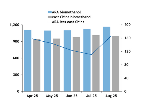 In August, Argus assessed east China dob biomethanol at $1,000/t compared with $1,164.60/t at the Amsterdam-Rotterdam-Antwerp hub (see chart). With FuelEU accepting certified bunkering outside Europe, shipowners can mass-balance cheaper Chinese or Singaporean biomethanol into EU voyages, bypassing Europe's higher biodiesel and e-methanol premiums.
