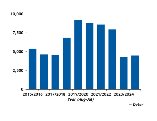Deforestation over the 12 months ending in July reached 4,495 km² (1,735 square miles), up by 4pc from the 4,321 km² a year earlier, according to preliminary satellite imagery from Brazil's national institute of space research's real-time deforestation system, Deter.