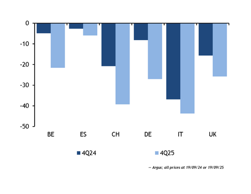 Forward price spreads to neighbours suggest expectations that France will be a stronger exporter than last winter. France's discount for the front quarter averages €27.19/MWh across its six directly interconnected neighbours, out from a €15.18/MWh discount for the fourth-quarter 2024 contract in mid-September last year (see price graph). Meanwhile, first quarter 2026 is at an average discount of €18.35/MWh across the neighbours for which Argus assesses contracts, out from €8.69/MWh at this point last year.