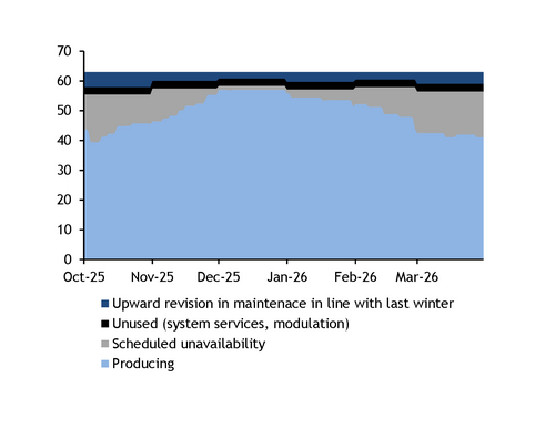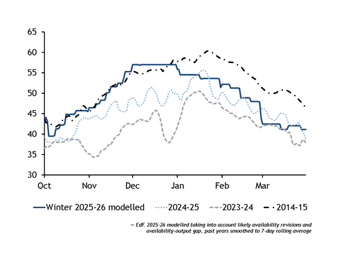 Unavailability across EdF's French fleet is scheduled at 7.7GW in the fourth quarter of 2025 and first quarter of 2026. This is far lower than unavailability since at least 2018, although the final figure is unlikely to be this low as EdF systematically adds maintenance closer to delivery.