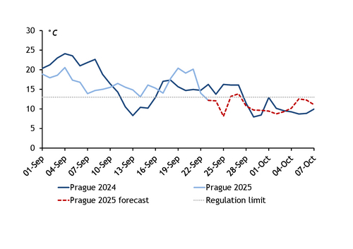 Average temperatures in Prague were forecast on Tuesday to be low in the coming days, but increasing to 13.5°C on 26-27 September (see graph). That said, temperatures are projected to hold well below 13°C from 28 September onwards, suggesting that the supply of heat could start around that time, in line with national law.