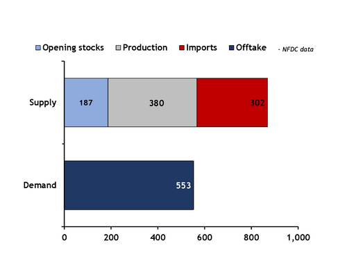 Pakistan began August with 327,000t of DAP in stocks, data from government agency the NFDC show. The country produced 77,000t of DAP during the month, broadly in line with the long-term norm, but it only imported 50,000t compared with average imports during the kharif season (April-September) of 63,000 t/month. Importers were dissuaded from bringing in more DAP in August following 128,000t of imports in June, high international prices and expectations that a lack of affordability among farmers would lead to lower-than-usual domestic offtake over the rest of the kharif season.