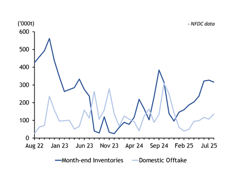 Pakistan's DAP stocks fell by 11,000t in August as offtake picked up seasonally. But inventories are expected to be more than sufficient by the start of the October-March rabi season, which could discourage importers from stepping into the market and exposing themselves to high international prices.