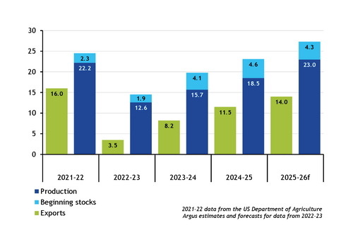 Argus forecast Australia's supply of wheat in 2025-26 (October-September) at a near-record high of 43.7mn t — including output, beginning stocks and imports. This is only 500,000t lower than the record reached in 2022-23.